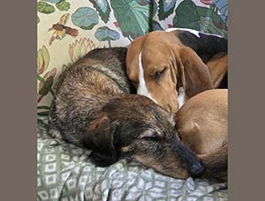 Faxe lider ingen nöd när det gäller sovkamrater. Huset kryllar nämligen av bastanta bassets, som mer än gärna delar bädd med honom. Här är det Ravel som han intagit kökssoffan tillsammans med. För en gångs skull en bild där han inte ligger inklämd inunder. Matte Charlotte skickade bilden.