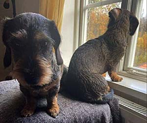De hussefixerade Ronja och Queen/Flisa går oroligt omkring hemma sedan han tagit på sig jaktkläderna och gått ut i skogen. Utan dem! Förklaringen är att det är älgjaktstider, och då får taxarna inte följa med. Längtan är svår, och då hjälper det inte att matte Katharina, som skickade bilden, försöker underhålla dem.