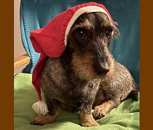 Det kom en julhälsning från Nina, som på julafton själv fick agera tomte, i likhet med många andra hundar, har jag sett på bild. Men förhoppningsvis kom tomten även till henne med julklappar. Matte Britt-Marie skickade bilden. Här hemma hos mig hoppas jag att tomten snart kommer med ett gäng små valpar. Den blivande mamman har börjat antyda att det kan vara på gång redan det närmaste dygnet.