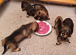 I går var det dags för valparna att få prova på det där med att äta på tallrik, och då var det mager köttfärs som serverades. Stor misstänksamhet bland hanarna, medan Saskia raskt hajade galoppen och käkade så det stod härliga till. Så småningom vågade sig några att killarna på att smaka lite grand. Men det blir säkert bättre nästa gång. Jag lade ut en liten film om detta på min Youtubekanal, så kolla gärna in.