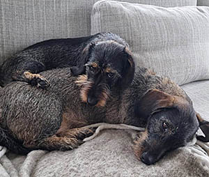 Det kom en bildhälsning från trogna kompisarna och släktingarna Isolde/Svea och Ruffa. De gillar att ligga tätt ihop, och här är det soffan som får tjäna som underlag. Isolde (underst) är ett levande under som för två år sedan var dödsdömd genom sin mjälttumör, men förra året lyckades hon trots det knipa SM-titeln på viltspår, och hon hänger alltså med ännu. Matte Sofia skickade den gulliga bilden.