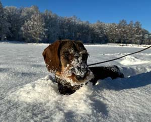 I dag vaknade vi här hemma till rena vårvädret, där stora delar av snön hastigt tinat bort. Hur det är i Skåne vet jag inte, bara att det även där var ovanligt mycket snö där i år. Bilden på Rufus/Leif är dock från tidigare i vinter, och jag antar att det tinat även där. Husse Magnus skickade bilden.