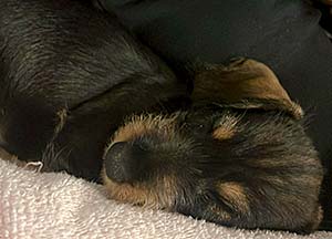 Nu har Seppo varit en dryg vecka i sitt nya hem, där han inte bara fått nytt namn (Sven) utan även kompisen Ozzy/Steffe, som är son till Gaia. Så nu leks det av hjärtans fröjd, men sen blir man så trött om man är en liten valp och då är det gott att sova. Matte Catharina skickade den gulliga bilden.