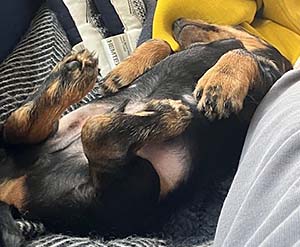 Först och störst i kullen var han och bra på att hålla sig framme. När jag namngav valparna tyckte jag att just han skulle få namnet Sverker efter Sverker Olofsson. Precis som de andra valparna i kullen tycks han ha funnit sig fint till rätta i sin nya tillvaro. På bilden ser han ut att koppla av efter ett lekpass på typiskt sätt, alltså på rygg. Husse Ted skickade bilden.