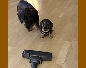Ibland ska det städas, och då kommer dammsugaren fram. Inte alltid hundens bästa vän. Mina hundar är inte överförtjusta, och Qnata mer eller mindre panikslagen. Men Raja/Rutan och Saskia på bilden verkar ta det hela lugnt, i alla fall att döma av deras uppsyn på bilden, som jag norpade från deras Facebooksida.