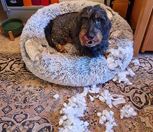 Reklamen för dessa rogivande så kallade fluffy beds är förledande, och jag gick på det trots att jag känner till Jizzas förtjusning i att tugga sönder grejer med vitt fluff i. Det var lugnt ett tag när hon var skendräktig, men nu är ordningen återställd enligt henne, och bädden är nu bara halvfylld. Jag kanske kan ta upp detta problem när vi är på taxkonferens i helgen. Det är nog fler som känner igen sig.