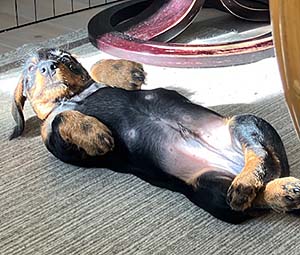 Det kom en hälsning från Sverker, snart tre månader gammal. Även han uppskattar att ligga och njuta i solen, och då gärna på rygg med korslagda ben. Ja, dessa taxar med sina olika liggstilar. Husse Ted skickade bilden.