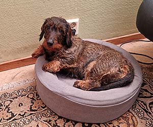 Det står ett antal hundkorgar runt om i lägenheten, så mina hundar har en del att välja på. Förutom soffor och fåtöljer, förstås. Av någon anledning gillar Qnata att rulla ihop sig i den här lilla runda korgen, medan Jizza inte skulle ta i den med tång. Fast oftast ligger de och vräker sig i den gamla träsängen, tillsammans. Men snart kommer den att bli upptagen av nya valpar, om allt går vägen.