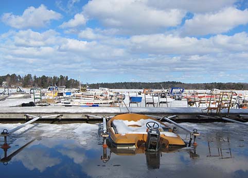 Mor Annas brygga på Lidingö är knutpunkten för Storholmsborna. Sparkar ligger sida vid sida med snöskotrar, men snart spricker isen upp så att båtarna kan tas i bruk.